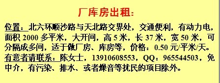厂库房出租:位置:北六环顺沙路与天北路交界处,交通便利,有动力电,面积2000平米,大开间,高5米,长37米,宽50米,可分隔成多间,适于做厂房、库房等,价格:0.50元/平米/天,有意者请联系:陈女士,13910608553,QQ:965544503,免中介,有污染、排水、或者燥音等扰民的项目除外。