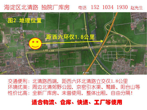 位于海淀区北安河,北清路西段,独院占地3600平米,新建厂库房2160平米,水动力电齐全,交通便利,整体出租,有意者价格面议!中介、广告勿扰!